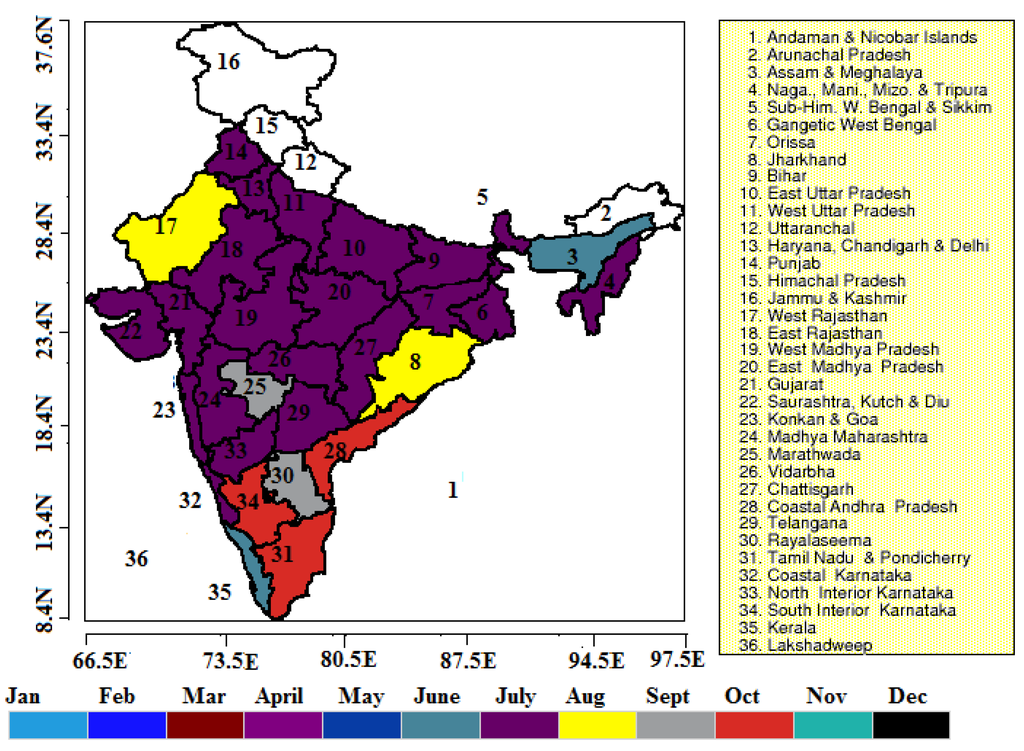 The MRPM for all-India rainfall is calculated using the centroid method, and found to be in month of July. The MRPM for 30 sub-divisions have been calculated and shown in Figure 1. It can be observed from the Figure 1 that the MRPM for Kerala is June, the month which marks the beginning of the monsoon season in India. The correct prediction of monsoon onset over Kerala is crucial for farmers to enable them to formulate their crop strategy []. The MRPM for coastal Andhra Pradesh, Tamil Nadu, and south interior Karnataka, is October and; for Rayalseema, it is September and the MRPM for the rest of the country is shown in Figure 1.