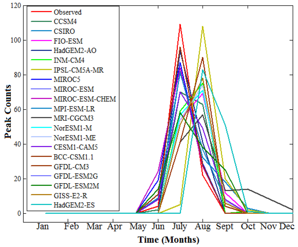 With the specific end of identifying the models that best fit for the observed data, the MRPM count from 1871 to 2005 is calculated, which indicates the number of times MRPM is repeated over the time period.The peak count for observation dataset and 20 models are shown in Figure 2. It is observed from Figure 2 that almost all the models simulate the course of the annual cycle quite well with maximum precipitation during June to September (JJAS) period; however, only nine out of the 20 models capture the peak count. The result shows that the MRPM count for all-India observed is 109 over 135 years. We conclude that the models, namely, CSIRO, FIO-ESM, HadGEM2-AO, MIROC5, MIROC-ESM, MIROC-ESM-CHEM, MPI-ESM-LR, BCC-CSM1.1 and HadGEM2-ES best approximate with observations as per MRPM count.