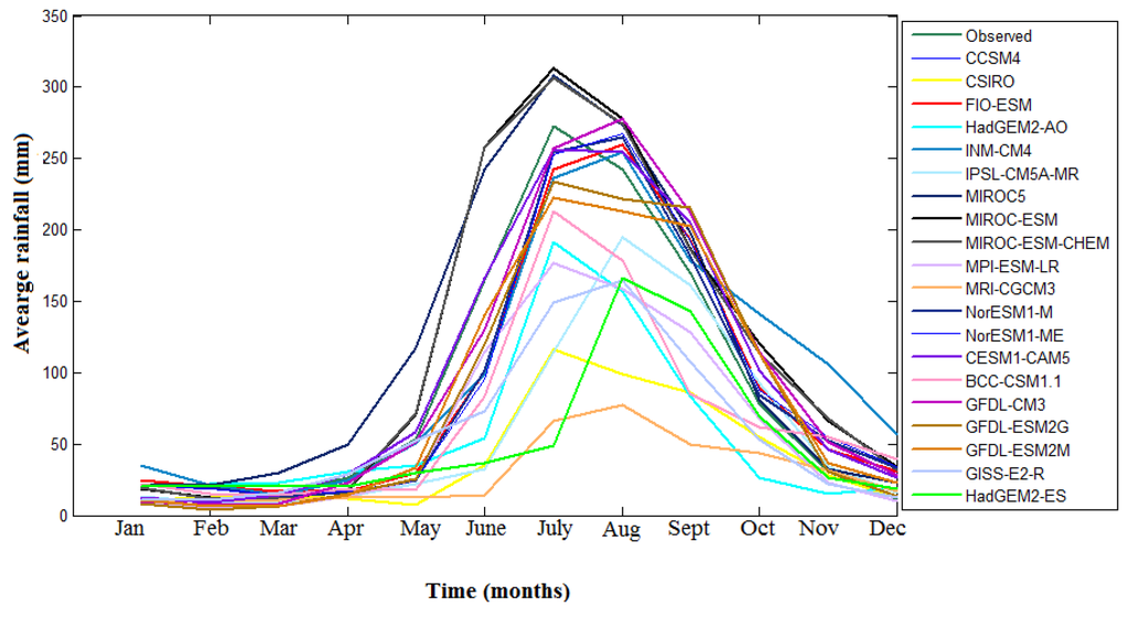 Furthermore, the average intensity of all-India rainfall has been calculated from 1871 to 2005. The average intensity of rainfall for the observed and 20 models over the year is shown in Figure 3. It is observed from the Figure 3 that seven out of 20 models capture the rainfall intensity approximate to observations. Few others show large differences in magnitude. The rainfall intensity of the models, CCSM4, MIROC5, MIROC-ESM, MIROC-ESM-CHEM, GFDL-CM3, GFDL-ESM2G, and GFDL-ESM2M is closer to the observation rainfall intensity than other models. These observations are consistent with results reported in Menon et al. [].