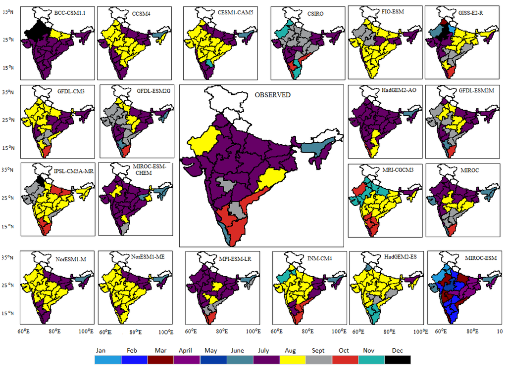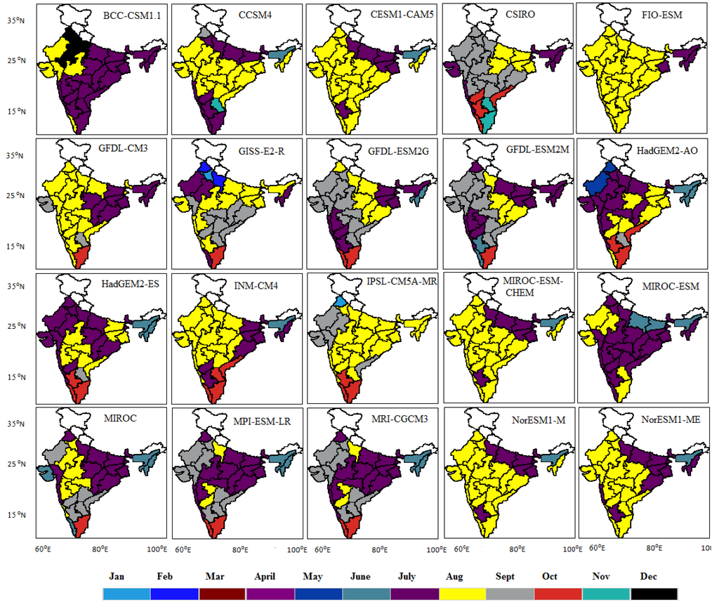 The spatial distribution of the MRPM of projected data (2006–2100) for all of the 20 models is shown in Figure 5. It is observed that there is no significant changes in projection of the winter monsoon, with the one exception of south interior Karnataka where the MRPM is likely to be in September instead of October. Certain changes are expected in future projections for the summer monsoon. For example, as per the projection of the model HadGEM2-AO, the peak month of rainfall for eastern Uttar Pradesh, eastern Madhya Pradesh, Bihar, and Jharkhand is likely to shift from July to August; whereas the peak months for Nagaland and Manipur are likely to shift from July to June.