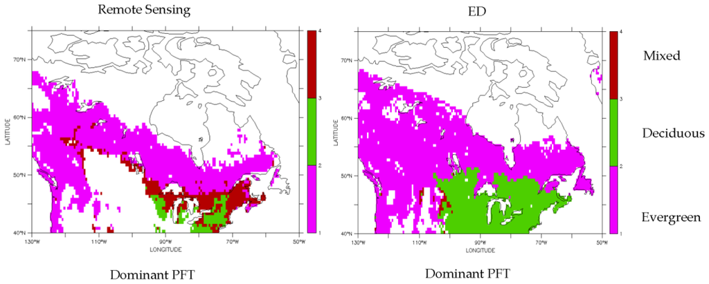 ED was then run for 500 years with current climate data in the domain of northern North America (40°N to 75°N and 165°W to 50°W) to establish the predicted current dominant PFT. The average year of the entire dataset (1901–2010) was used as the driver. Dominant PFT was determined by applying the National Land Cover Dataset 1992 (NLCD92) [36] forest classification definitions of deciduous, evergreen, and mixed forests to the output. These definitions call for 25% of a site to have tree cover to be classified a forest, and greater than 75% of that cover to be a specific type to not be considered a mixed forest. ED was then run with a future climatology over the same domain using the average of the last five years of the dataset (2065–2070). The model was run for 500 years and the NLCD92 classification applied as in the previous part. A comparison between current and future dominant PFT showed the percentage of sites expected to convert type and the specific conversions (i.e., evergreen becomes deciduous forest, non-forest becomes evergreen).
