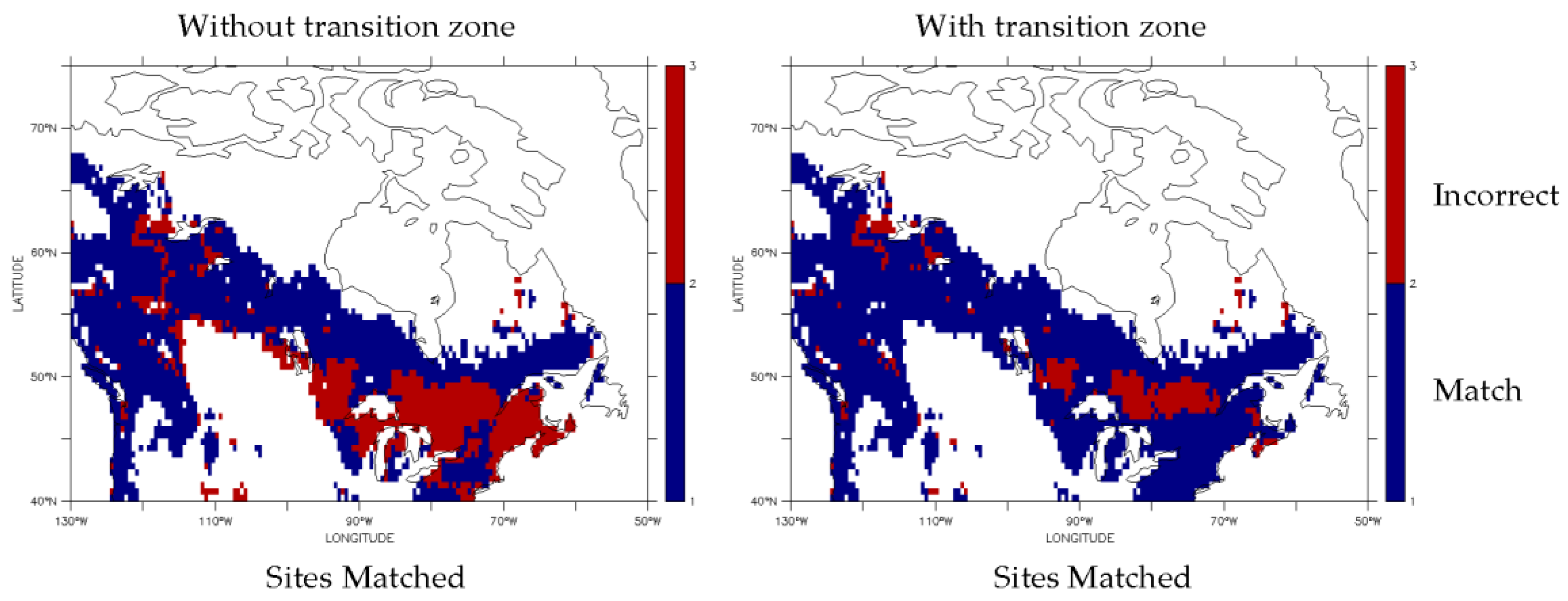 Areas of agreement (blue) and disagreement (red) without (left) and with (right) the mixed forest considered a transition zone.