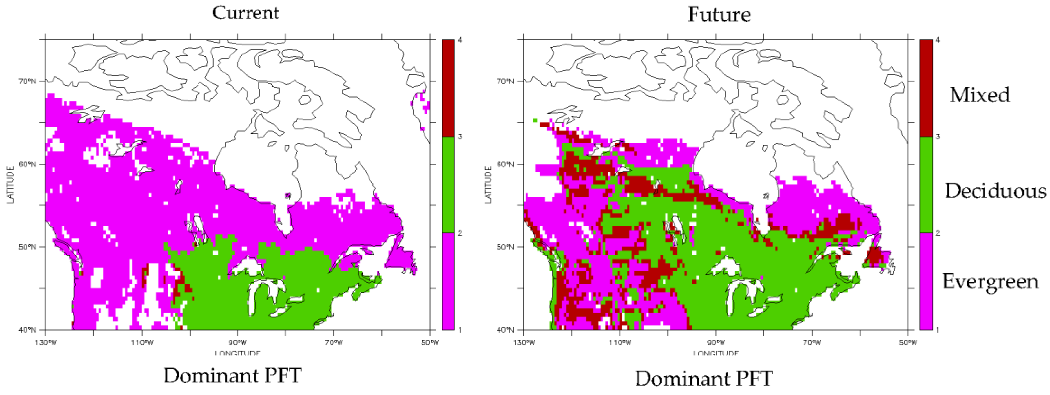 The predictions of dominant PFT distributions based on current climate were next compared to those based on future climate (Figure 3).