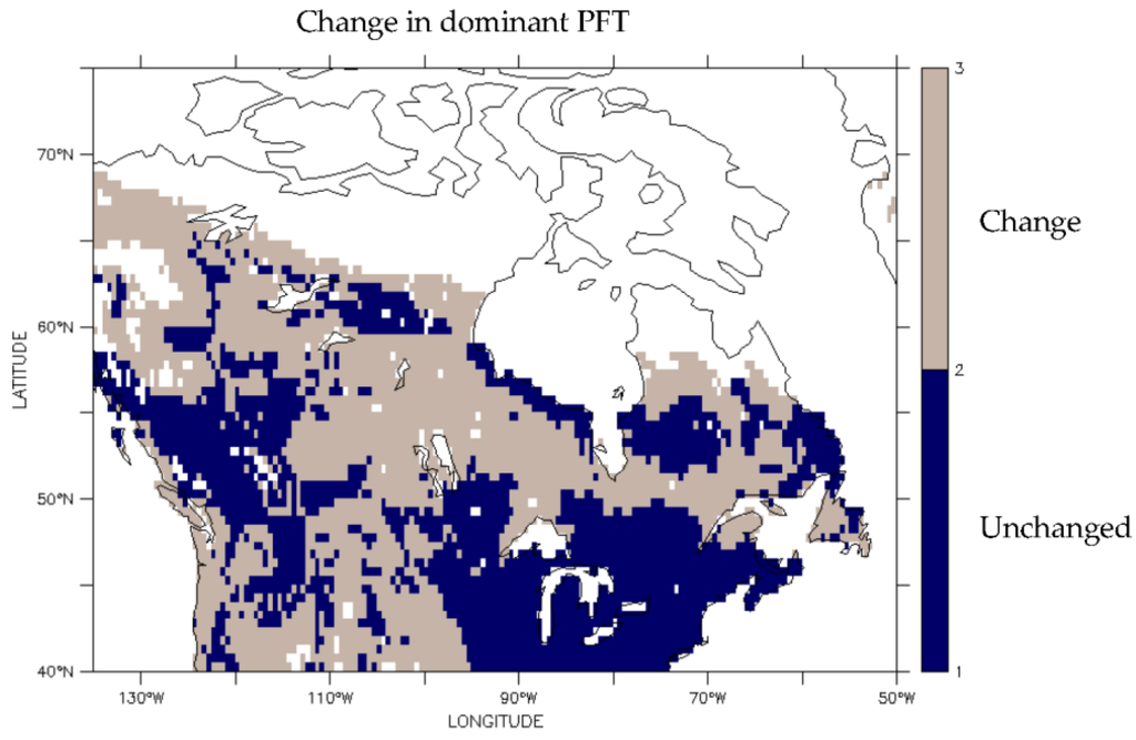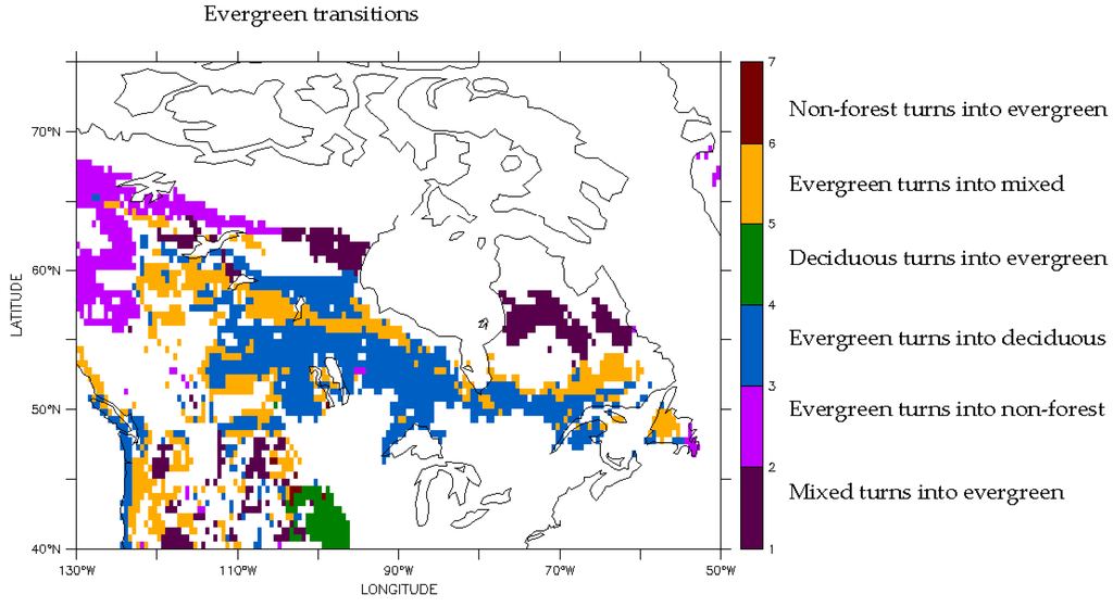 Under future climate conditions, total forest cover increased from 4764 sites to 4839 sites, a 2% increase. Deciduous sites increased from 1223 to 2159 sites, a 77% increase, while evergreen sites decreased from 3497 to 1811 sites, a 48% decrease. Overall, 58% of the domain changed dominant PFT (Figure 4). All the transitions between PFTs and non-forest were tracked, but evergreen expansion and withdrawal accounted for ~90% of the predicted change (Table 1). The transitions are shown with a dominant PFT change map (Figure 5).