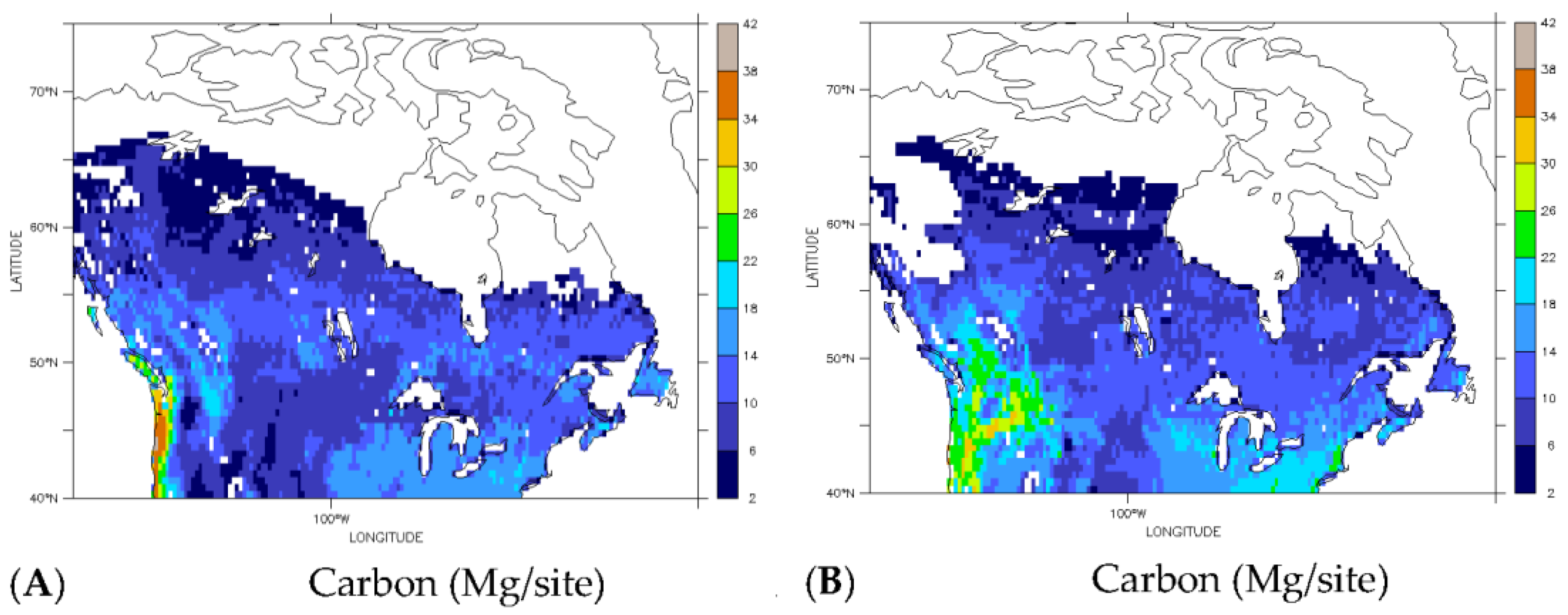 In response to climate change, total carbon across the domain increased 8%. This aggregate increase was a combined result of an increase in deciduous carbon and decrease in evergreen carbon. Total terrestrial carbon increased 4 Tg (8%), deciduous carbon increased 16 Tg (107%), and evergreen carbon decreased 12 Tg (31%). In terms of percentage of carbon by PFT, deciduous carbon increased from 28% to 54%, and evergreen carbon decreased from 72% to 46%. Though regional total carbon increases are relatively modest, the underlying gridded changes were larger and had a wide distribution (Figure 6), and differed by PFT (Figure 7).