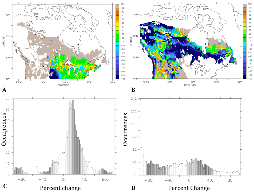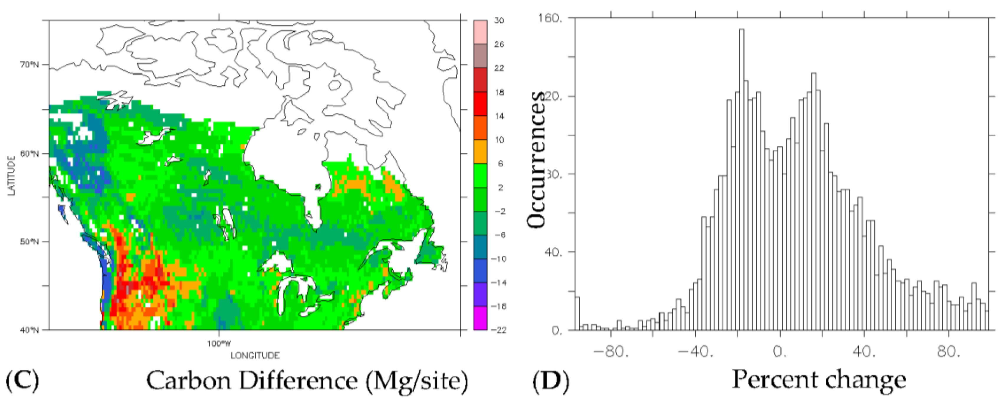 The percent change in (A) deciduous; and (B) evergreen terrestrial carbon from climate change, and histograms of the percent change occurrences (C,D).