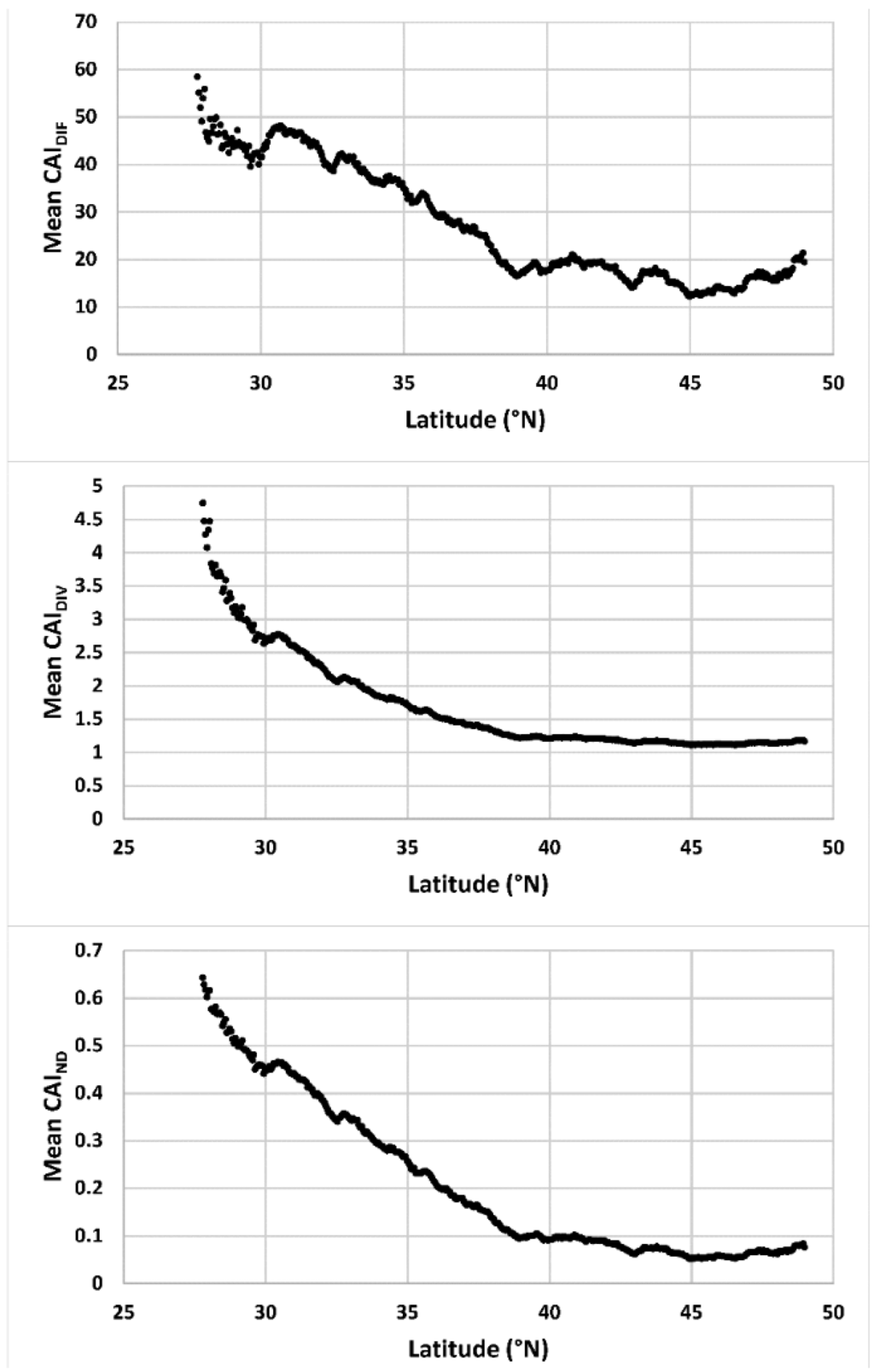 Extracted north-south (latitudinal) gradients of CAIs within the humid temperate domain in the eastern U.S. (cf. Figure 1f) are evident (Figure 2). All CAIs demonstrated gradually decreasing values with increasing latitude. Further, CAI decline with latitude is relatively rapid up to 38°N; afterwards the change becomes small. Among the three CAIs, CAIDIF is most noisy and shows a sharper transition across the 38°N parallel. CAIDIV is most smooth and resembles an exponential decline process that can be modeled with a logistic function []. CAIND integrates features of the previous types and additionally provides a wider range of CAI variability as shown by a slightly steeper slope. The CAIND gradient also shows a piece-wise response divided by approximately the 38°N parallel. Interestingly, this latitude coincides with the boundary of mesothermal (above-freezing winter) and microthermal (sub-freezing winter) climates [], and is around a transitional zone between areas with different long-term phenological trends [].