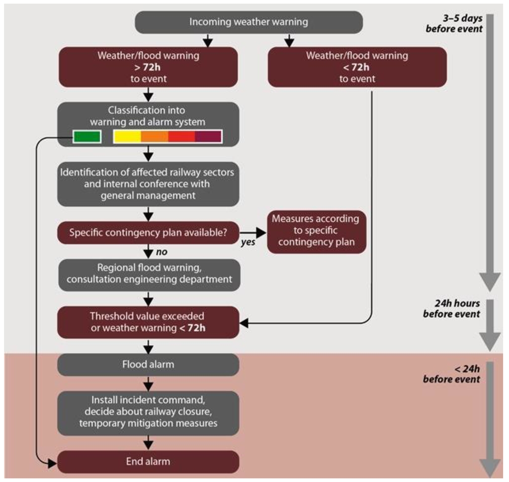 Flowchart of procedures in case a threshold value for a CMC is exceeded and a weather warning (and/or flood warning) is issued. (Source: ÖBB).