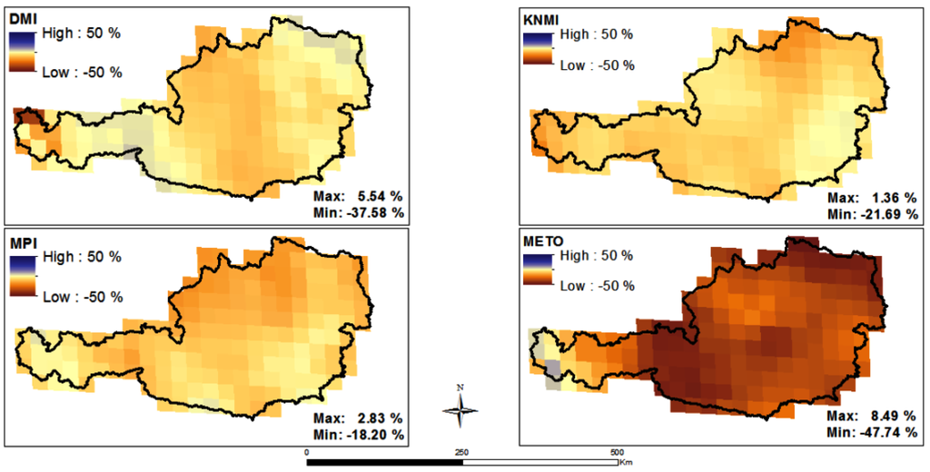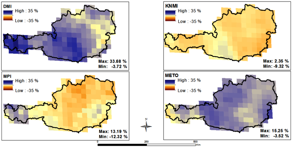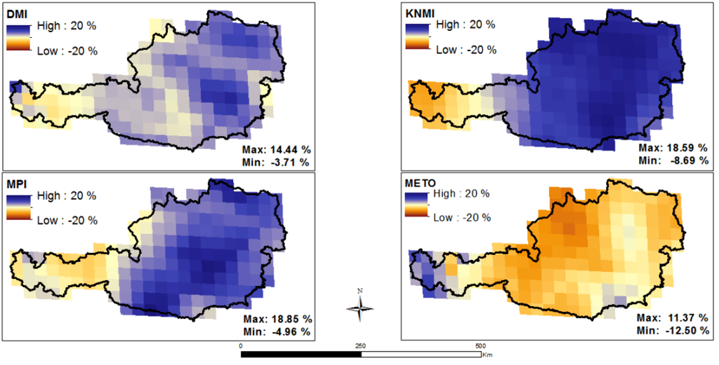 Figure 2 depicts the mean percentage difference of rainfall in the winter season as projected by the selected RCMs. Three out of four models project a maximum increase in rainfall varying between around 14%–19% for the central and eastern part of Austria, whereas for the country’s western part the rainfall is likely to decrease by up to around 9%. Regarding the spatial patterns, the DMI-model, the KNMI-model, and the MPI-model agree quite well. The METO-HC-model, however, is contradictory to the other models, since it indicates an opposite spatial trend in rainfall. In order to further evaluate the depicted signals, the percentage averages of rainfall change for Austria are specified in Table 4. Herein, the average changes show a marginal increase of approximately 5%–10% for the models DMI, KNMI, and MPI, whereas the METO-HC-model is likewise contradictory by calculating a slight decrease of around 4%. According to IPCC [31], a simple approach to assess the robustness of climate change signals is to check the matching rate of simulation results with respect to the direction of change. They define a signal direction as being “likely” if more than 66% of all results agree in the respective direction. Following this approach, the mean rainfall in the winter season in Austria can be considered as likely to (marginally) increase until 2040.