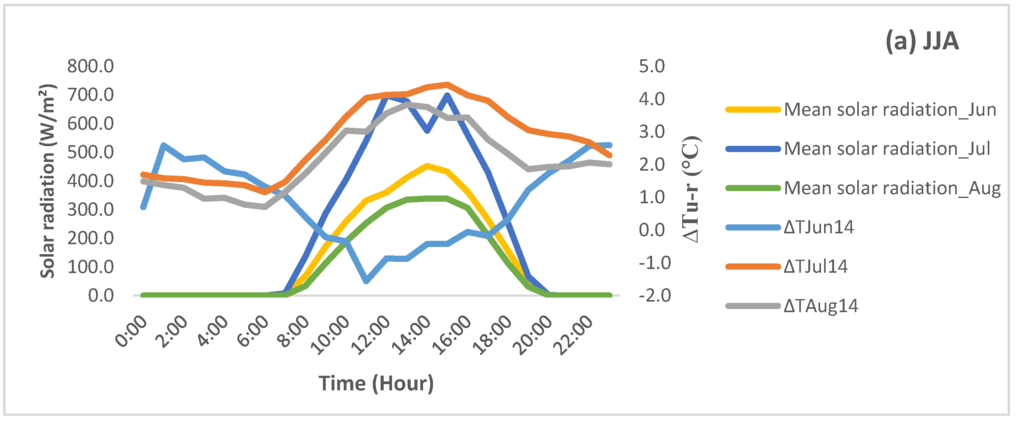 Figure 8 shows the effect of solar radiation on the UHI pattern in (a) JJA, (b) SON, (c) DJF and (d) MAM. In Figure 8a–d, the solar radiation pattern is the same, sunrise at 7:00 h local time and sunset at 19:00 h local time. The time period between sunrise and sunset is about 12:00 h throughout the season. It should be noted that solar radiation is used here as a substitute variable for cloud cover (i.e., low radiation values suggest greater cloud cover and vice versa). The cloud cover is observed universally closely correlated with UHI magnitude. It is also evident that apart from the monsoon months of July and August, solar radiation has an inverse relationship with the UHI pattern; daytime is when the solar radiation is highest (less cloud cover) but the daytime temperature difference between the urban and the rural site is lower, in most cases resulting in a cool island effect. However, the UHI intensity starts increasing about 4 h to sunset and this increases further after sunset, making the night time temperatures higher in the urban site. This is evidence that it is the heat that is trapped in the urban site due to the urban form, the building configuration patterns as well as contributions from dense, impervious surfaces that increase the amount of energy that is absorbed and eventually stored in the city; low-albedo surfaces, such as dark rooftops and asphalt roadways; anthropogenic heat sources such vehicular and building emissions could result from cooling systems [47,48,49].
