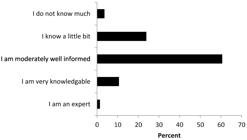 Climate change knowledge was self-assessed with the question, “How would you assess your current level of knowledge about potential climate change impacts in New York State?” (Figure 1). The response categories for this question were: I don’t know much, I know a little bit, I am moderately well-informed, I am very knowledgable, and I am an expert. The survey questions asked on the questionnaire are provided in the first column of Table 1, Table 2, Table 3 and Table 4. Climate change attitudes were assessed with a battery of 18 items and the questions are listed in column 1 of Table 4.