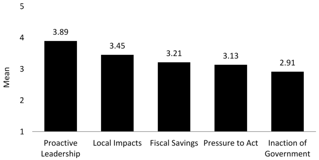 Prominent factors influencing climate mitigation and adaptation action by respondents were being a responsible and proactive leader, having observed evidence of local impacts from climate change, and seeing evidence of savings or other fiscal benefits (Figure 2). Proactive leadership was comprised of being proactive and getting a head start on addressing changes, being a responsible leader, cooperating with other agencies and developing useful partnerships, and thinking both globally and locally. Local impacts encompassed impacts of or threats of climate change at the local level, scientific evidence that climate changes are real, conserving resources and building resilience, and also concerns about social equity. Thus, experiencing climate change at the local level was related to taking action. Lack of climate change action at state and federal (policy) levels was not a strong motivating factor regarding climate actions taken.