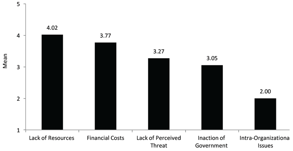 Conversely, the most significant barriers described by those who had not taken climate mitigation or adaptation actions included lack of financial and human resources, costs relative to benefits, and lack of a perceived threat or understanding of climate change (Figure 3). Lack of resources was about the lack of funding and staff to take on new initiatives. Financial costs were comprised of both mitigation and adaptation costs and also a belief that savings are not realized immediately. This cost may be too high in light of other pressing problems that demand a respondent’s attention in their agency or organization. The financial cost barrier was related but distinct from the lack of resources barrier, which was about lack of funding and staff to develop new programs or take on new initiatives, especially with a feeling of being overwhelmed and not knowing where to start. Conflict over climate change within the respondent’s agency or organization did not appear to be a significant barrier, nor did inaction of government on climate change.