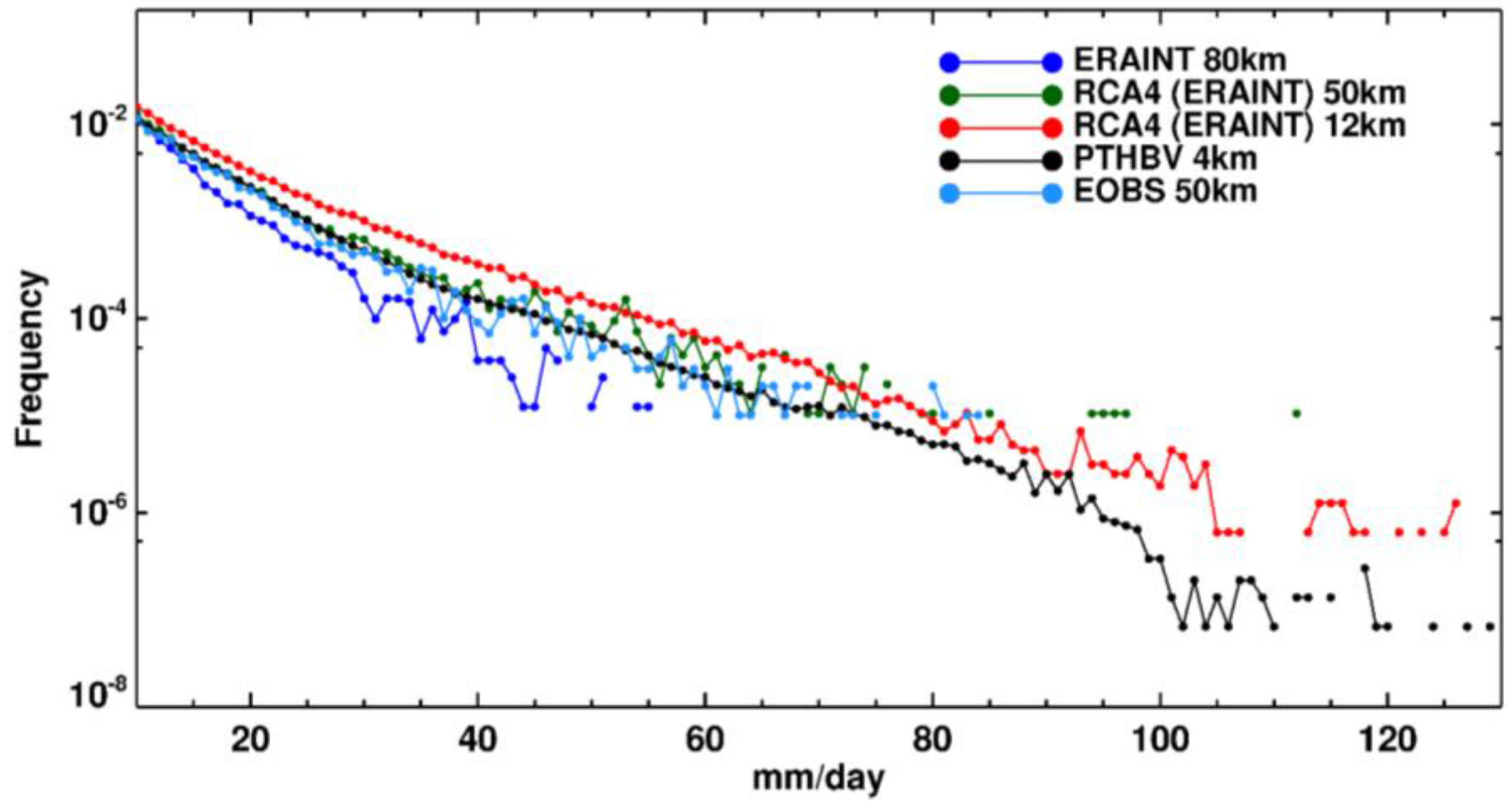 - Olsson, J.; Berg, P.; Kawamura, A. Impact of RCM spatial resolution on the reproduction of local, sub-daily precipitation. J. Hydrometeorol. 2015, 16, 534–547. [Google Scholar] [CrossRef]