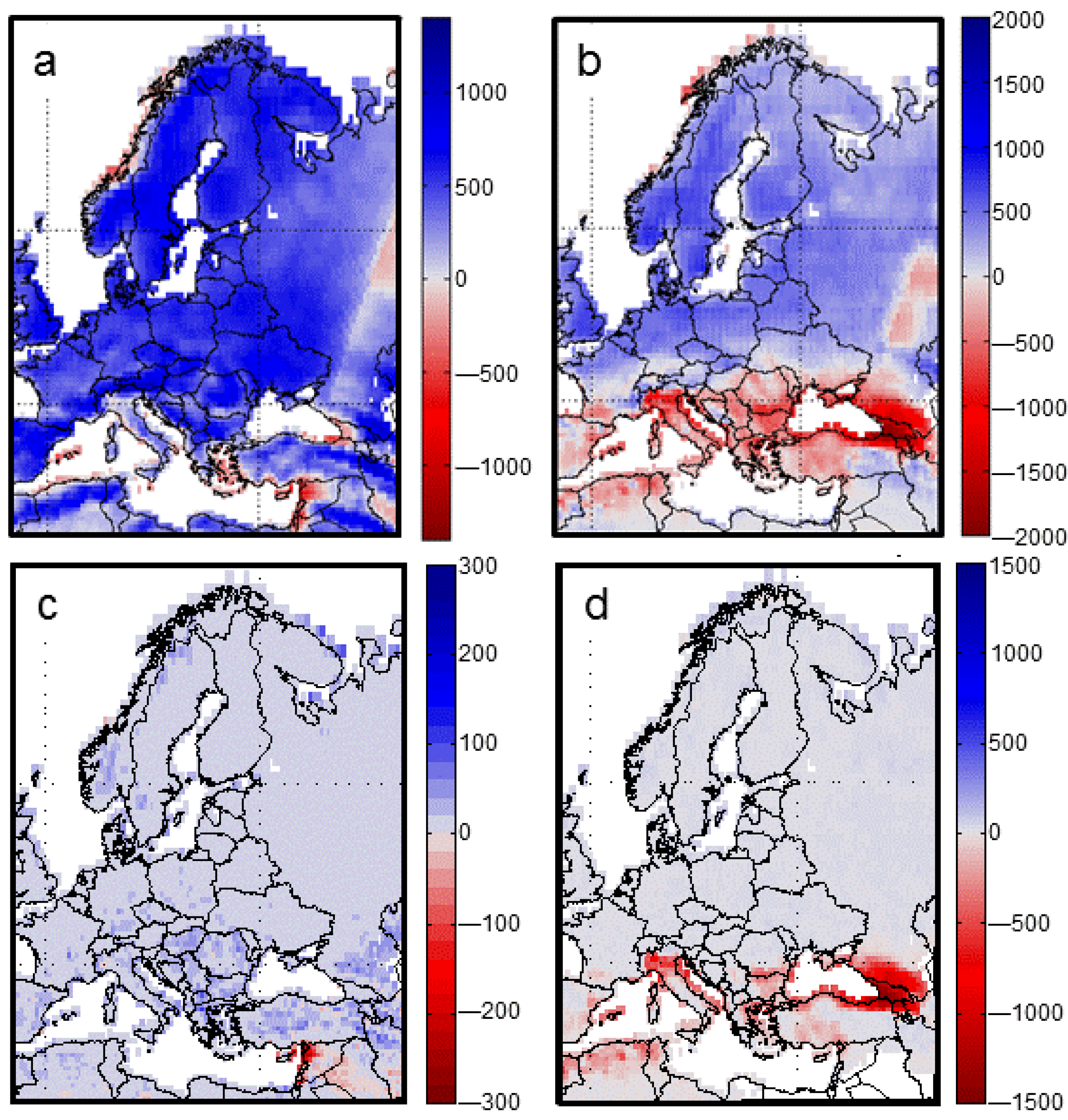 - Giorgi, F.; Marinucci, M.R. Improvements in the simulation of surface climatology over the European region with a nested modelling system. Geophys. Res. Lett. 1996, 23, 273–276. [Google Scholar] [CrossRef]