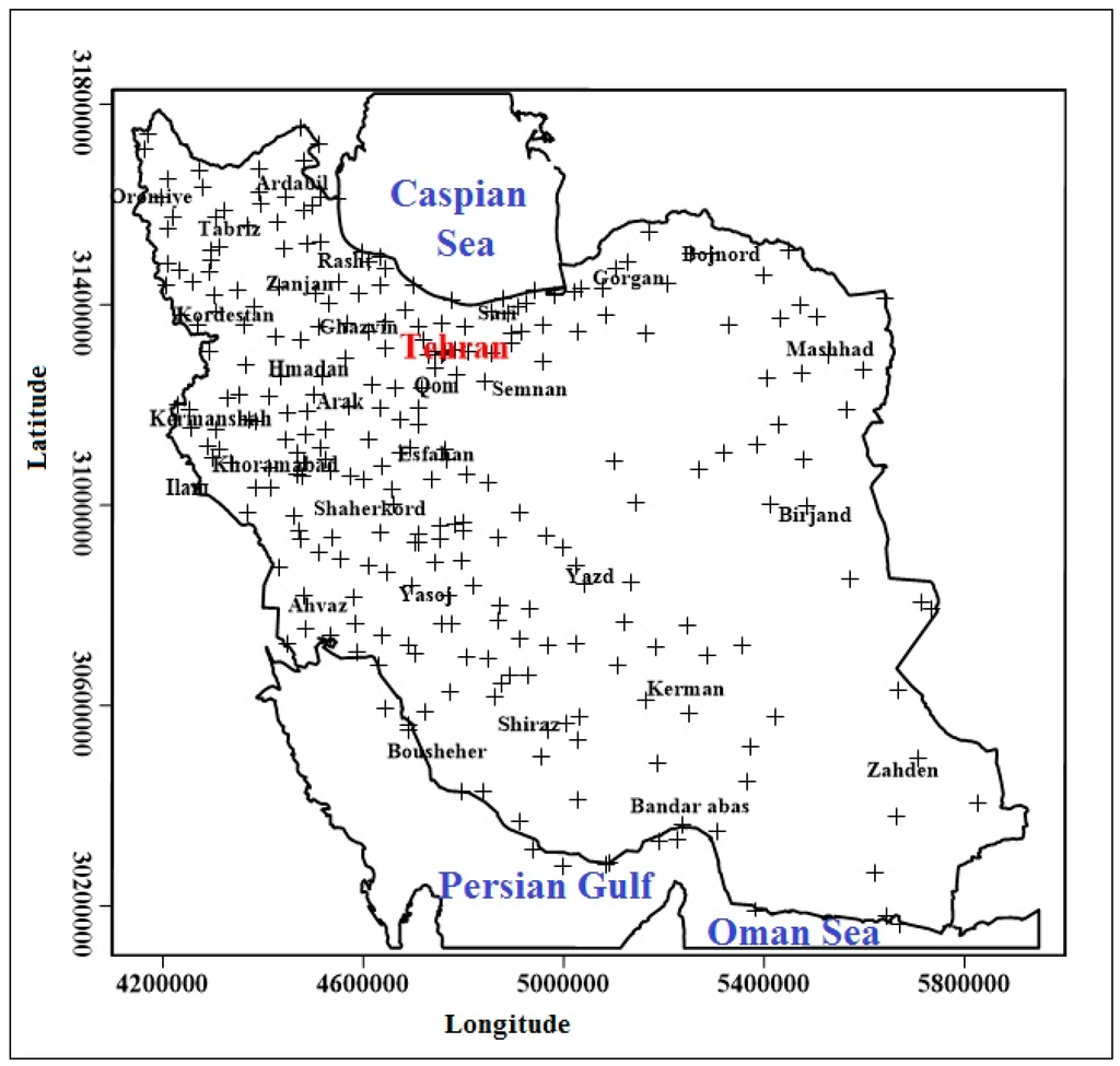 - Environmental data: This group of data was obtained through interpolation of values of daily minimum temperatures registered in stations from 1961 to 2010. The data over these 50 years, which were collected from 450 synoptic and climatology stations of Iran’s Meteorological Organization (IRIMO), were sorted and interpolated (Figure 1). The data of this database have a spatial resolution of 15 km × 15 km, which have been produced in the form of Lambert Conformal Conic Projection, and arranged in the form of a 7187 × 18262 matrix with an S makeup (time in rows and place in columns). After collecting the data, the next step was identifying frosts in each of the cells. In the majority of climate studies, an important part of the research is defining the studied variable because it will influence other research steps. Many researchers have considered temperatures below 0 °C as the cut-off criterion for identifying frosts [26,27]. In the current study, a condition should meet the following three criteria to be considered as an example of frost in Iran: