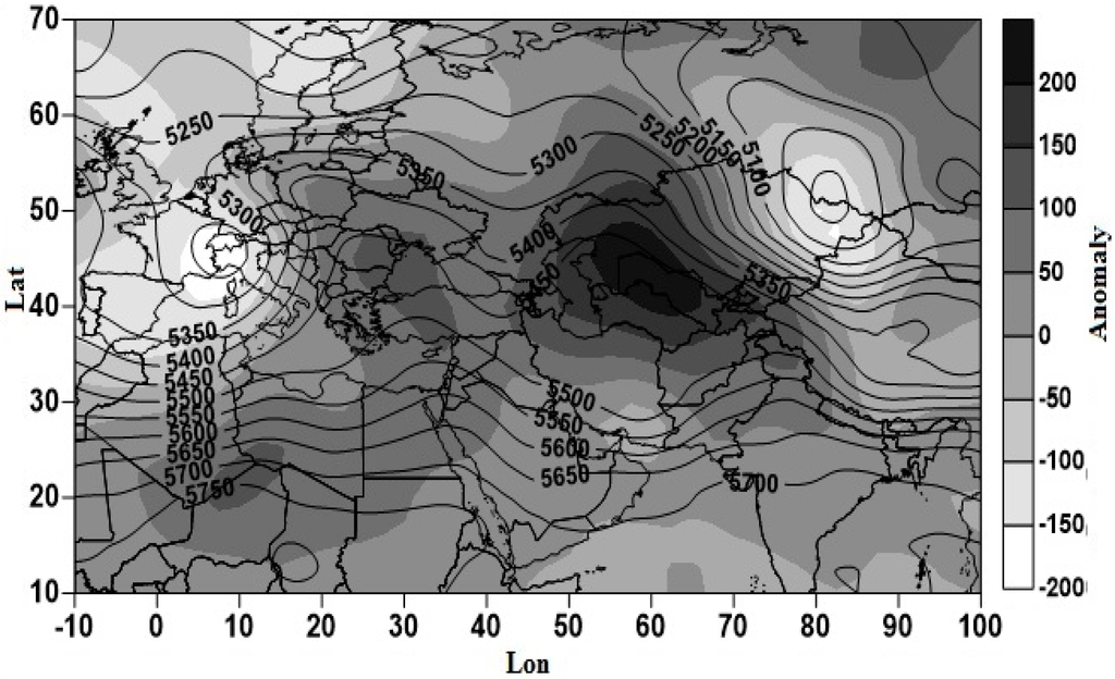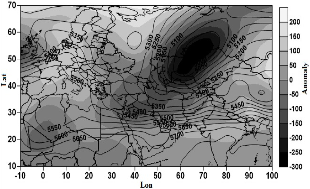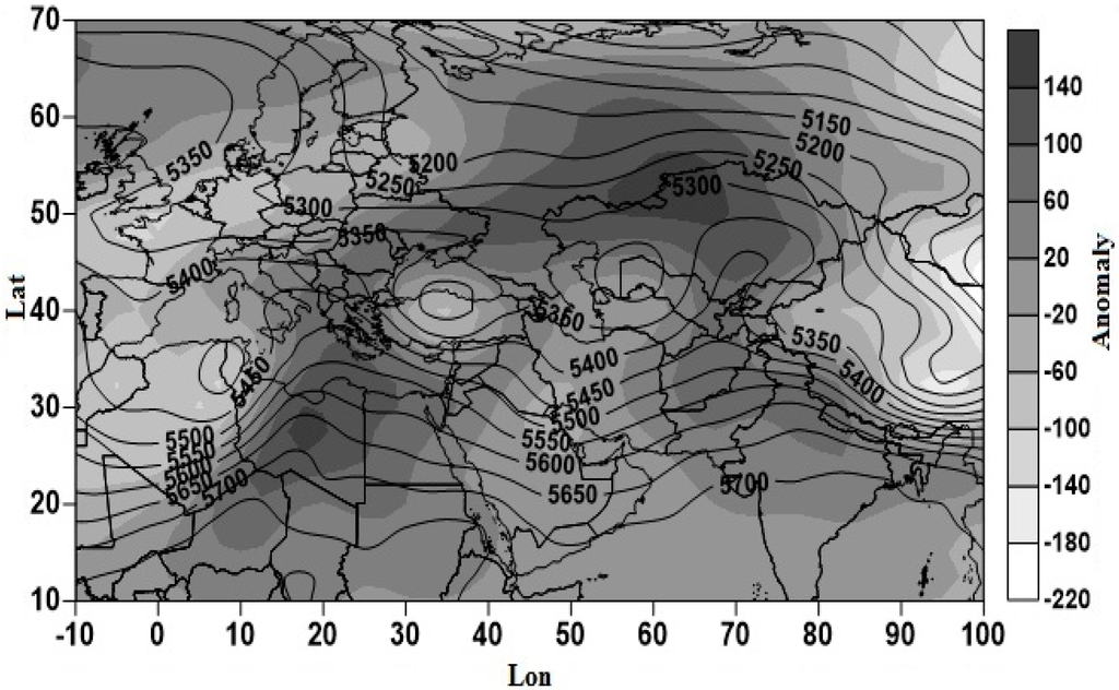 In this pattern of atmosphere thickness, southern Mediterranean Omega blocking is formed. Since the eastern part of Omega system is located on the east of Europe and the west of the Middle East, cold weather falls from higher latitudes toward these regions and the studied area. As a result of blocking system formation, west winds over western Mediterranean become meridional reaching polar areas. The northwestern part of Iran is in front of the path of this trough and the 5459 meter curve passes over this area. Spatial spread of these currents directs a larger proportion of cold weather from upper latitudes toward lower regions including the studied area. Thus, the temperature in this area significantly declines. On this day, the anomaly over the region was positive and between 150 to 100 m (Figure 11). Garcia conducted synoptic analysis for the north and northeastern frosts of Mexico, concluding that the main reasons for the frosts were the formation of blocking systems on the way of western winds and the existence of cyclone centers in the northeastern part of the United States [34].