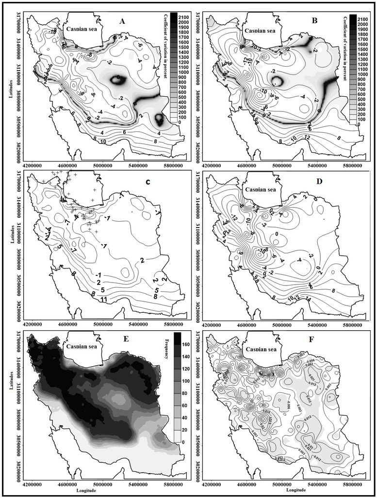 The fifth pattern: (A) Spatial distribution of temperature average and coefficient of variation for the whole group; (B) spatial distribution of temperature average and coefficient of variation for the representative day; (C) anomalies and center of masses for the whole group; (D) anomalies for the representative day; (E) frequency of frosts for the whole group; and (F) spatial distribution of the trend of Iran’s frosts for the whole group.