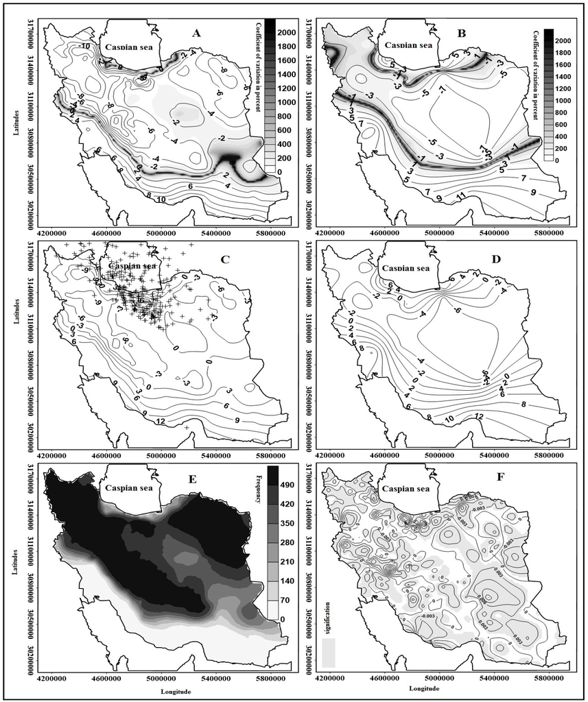 The third pattern: (A) Spatial distribution of temperature average and coefficient of variation for the whole group; (B) spatial distribution of temperature average and coefficient of variation for the representative day; (C) anomalies and center of masses for the whole group; (D) anomalies for the representative day; (E) frequency of frosts for the whole group; and (F) spatial distribution of the trend of Iran’s frosts for the whole group.