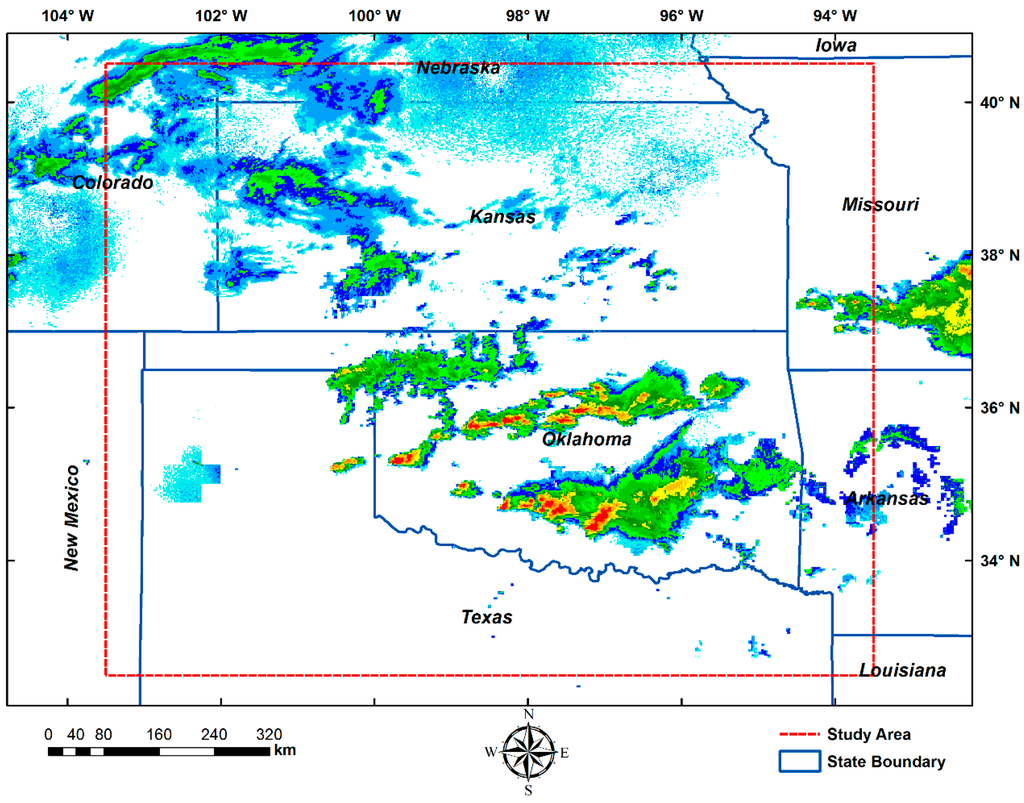 The radar reflectivity data and cloud-to-ground lightning data used in this research cover 32.5°N–40.5°N and 93.5°W–103.5°W (the red dashed boundary in Figure 1). The study domain mainly covers the states of Kansas, Oklahoma, and northern Texas. The data span a period of five years from 1 April 2010 to 30 September 2014, and only include warm seasons (April–September) each year. Severe thunderstorms are common features in the study area, so understanding their life cycle characteristics is significant for weather forecasting, disaster management, and hydrological management [31].
