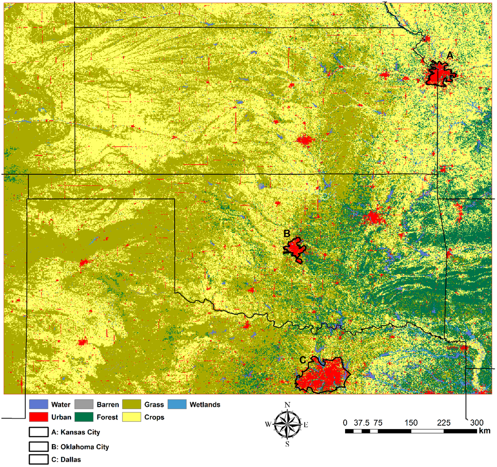 We also linked thunderstorms to land cover types, and found that thunderstorms favor forests and urban areas. Forests, crops, and grasses may trigger splits and mergers during the life cycle of a thunderstorm. Statistical analyses demonstrated that the urban areas in Kansas City and Oklahoma City had significantly higher thunderstorm occurrences than the surrounding rural areas, though the Dallas urban area did not show this feature.