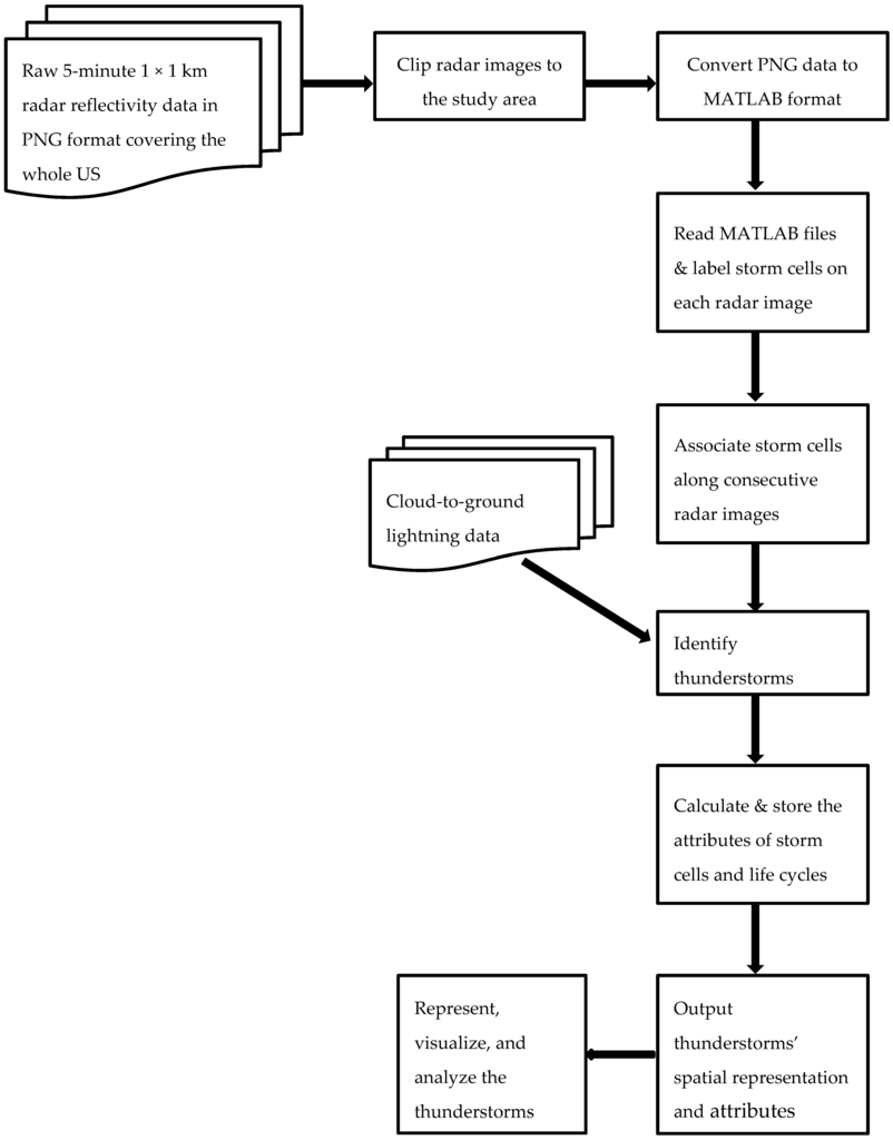 An application developed via MATLAB was utilized to process, extract, represent, and analyze the thunderstorms. A flow chart illustrating the key steps is shown in Figure 3. The radar reflectivity images are preprocessed by creating a subset of radar data over the study area and converting the data format. Afterwards, the three most important tasks are carried out, including storm cell delineation, storm life cycle extraction, and thunderstorm identification. A number of properties are calculated for the thunderstorms at both the cell level and life cycle level. At the cell level, we calculated the total reflectivity and area. Thunderstorm cells are approximated by ellipses, so we also calculated the orientation, major and minor axis of the ellipses. At the life cycle level, we calculated the duration, mean movement speed and direction during the life span of a thunderstorm. For the thunderstorm climatology, we also calculated the statistics of these properties.