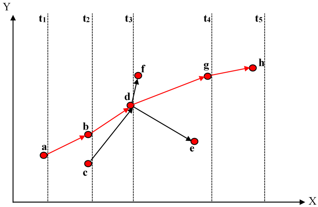 Figure 4 shows an example of a thunderstorm extracted from five radar images from time t1 to t5 with a duration of 20 min. We could see there are a total of eight thunderstorm cells in its life cycle. There are five interactions (initiation, continuity, split, merger, and termination) in the figure. The thunderstorm initiates from thunderstorm cell a at time t1, then develops into cell b at time t2. Cell b and c merge into cell d at time t3. At time t4, cell d splits into three cells e, f, and g, and finally this thunderstorm terminates at time t5 as cell h. Using the directed spatiotemporal graph model, the initiation, termination, split, and mergers can be quantified, which will be discussed in Section 3.