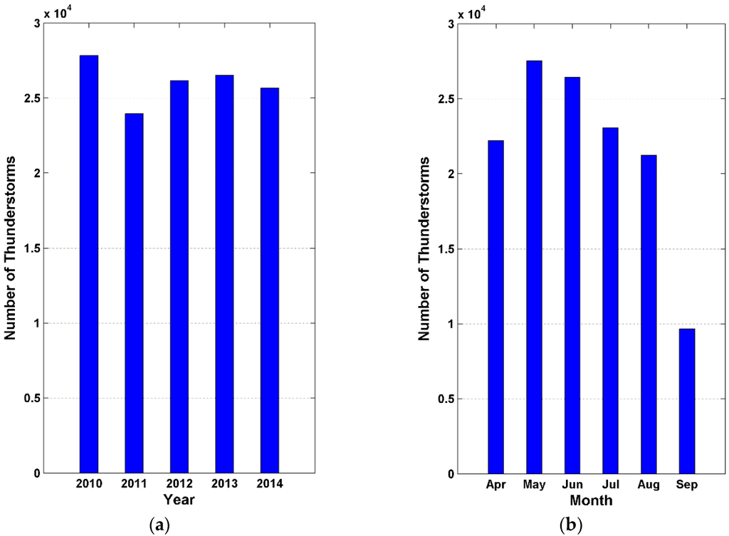 A total of 130,097 thunderstorms were identified across the study area during the five-year time period. Annual and monthly numbers of thunderstorms are shown in Figure 5a,b. On average there are 26,019 per year and the annual number of thunderstorms does not vary much with a coefficient of variation of 5.4% (Figure 5a). While 2010 has the most number of thunderstorms (27,824) during the study period, 2011 is the most inactive year (23,942). 2010 is 16% higher than the number in 2011. The number of thunderstorms in 2012 (26,164), 2013 (26,518), 2014 (25,649) does not differ greatly, which is around the mean number of thunderstorms (26,019).