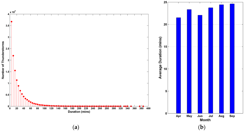 (a) Histogram of thunderstorm durations; (b) average duration of thunderstorms by month.