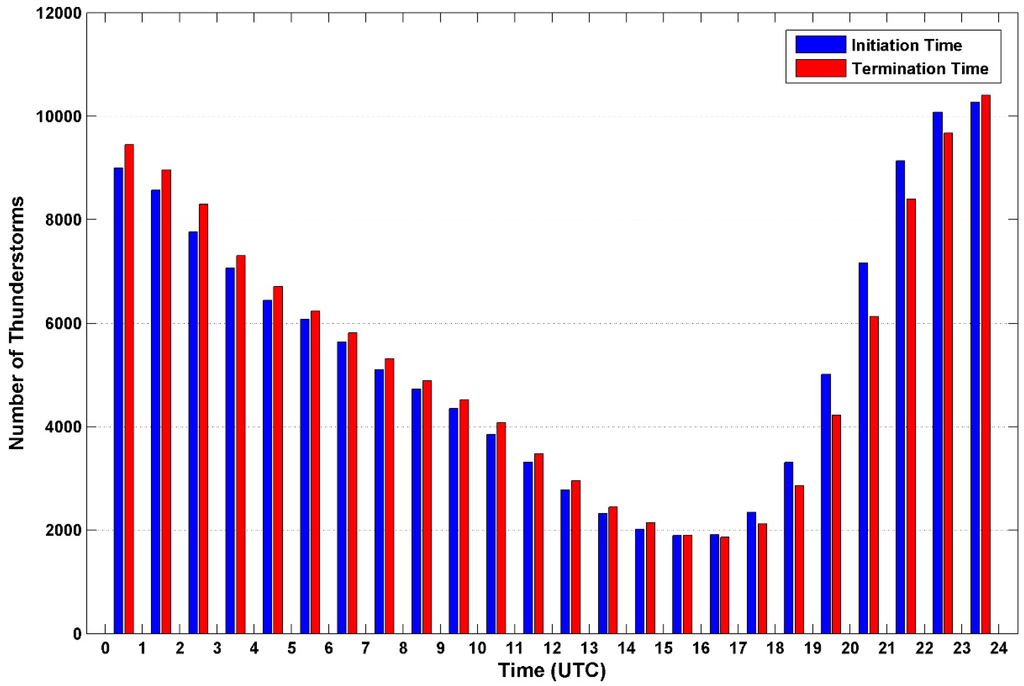 Figure 7 demonstrates the histograms of thunderstorm initiation and termination time. The most frequent time for thunderstorm initiation occurs from 2100 to 0000 UTC, which is in the early evening at local time and favors single cell and multicellular thunderstorms [21]. Thunderstorm termination is most common from 2100 to 0300 UTC.