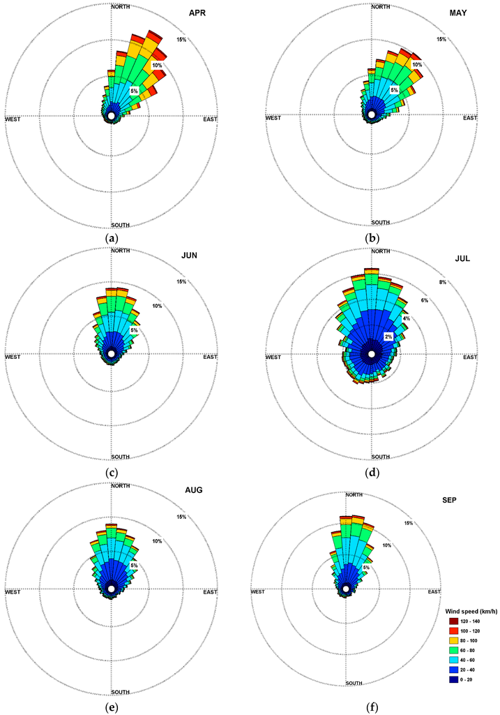 Figure 8 shows the monthly rose diagrams of thunderstorm movement speed and direction. The monthly average movement speeds are 63.2 km/h (April), 53.8 km/h (May), 48.1 km/h (June), 38.1 km/h (July), 42.5 km/h (August), and 47 km/h (September), which are similar to the climatological analysis in North Dakota in Mohee and Miller [33]. For movement direction, thunderstorms are most common between 0 and 90 degrees, with an average thunderstorm vector from the southwest to northeast during the warm seasons from 2010 to 2014.