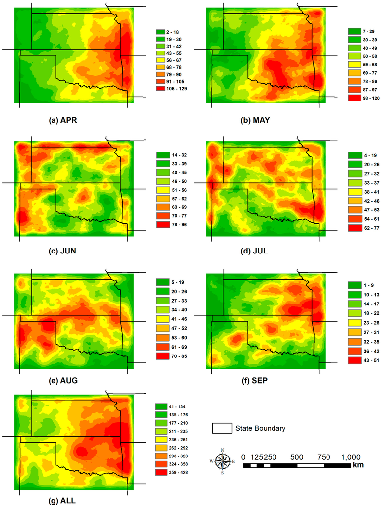 Thunderstorms further decrease gradually through July, August, and September (Figure 9d–f). In July, thunderstorm hot spots are scattered throughout the study area with some concentration in the state of Kansas and Oklahoma. In August, thunderstorms concentrate in the middle 1/3 of the study area covering southern Kansas, northern Oklahoma, and the most northern part of Texas. Thunderstorms concentrate along the border region between Kansas and Missouri and central Oklahoma in September.