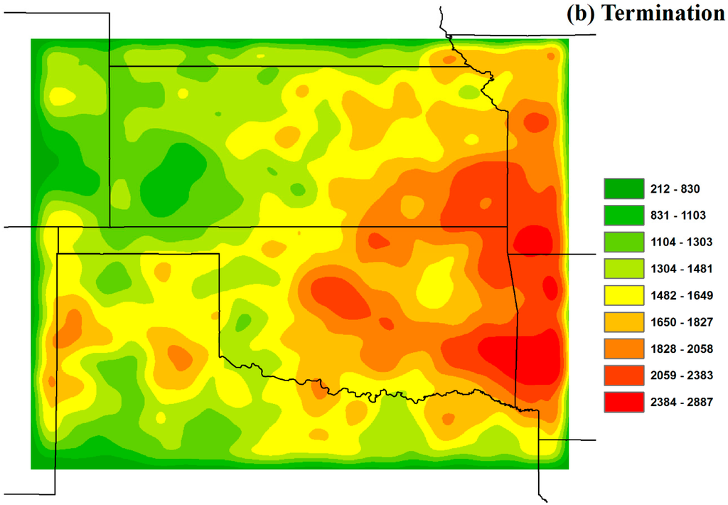 For the locations of thunderstorm initiation and termination, we used the starting and ending points of a thunderstorm’s trajectory, i.e., the maximum reflectivity path. The initiation and termination point density maps are shown in Figure 10 for the 5-year thunderstorm study to quantify active areas of thunderstorm occurrences. Figure 10 demonstrates the kernel point density analyses determining the concentration of points within a search radius of 0.5 degrees of each initiation and termination point. The spatial distributions of initiation (Figure 10a) and termination density (Figure 10b) are quite similar with the greatest density on both maps found along the border between Oklahoma and Arkansas, and on the southern part of the border between Kansas and Missouri. In Kansas, initiation and termination hot spots are mainly located in the southeastern corner of Kansas. In Oklahoma, thunderstorm initiations and terminations are most concentrated in the eastern half of Oklahoma. In Texas, initiations and terminations are concentrated mainly in northern Texas and at the border between northern Texas and New Mexico. By overlaying the initiation and termination density maps with the land cover map (Figure 2), we find that forest and crop land cover types contain most initiation and termination hot spots located in the border between Kansas, Missouri, Oklahoma, and Arkansas. Urban areas also have higher initiation and termination density.