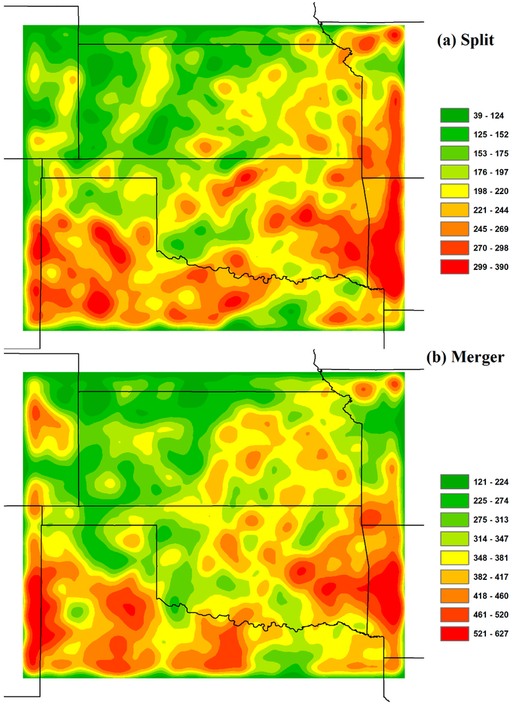 As for the spatial distribution of splits and mergers (Figure 11), their hot spots have some similarities. They are mainly located along the border between Oklahoma and Arkansas and the border between Kansas and Missouri, in central Oklahoma, and northern Texas. When comparing Figure 10 and Figure 11, the biggest difference is in the panhandle area of northern Texas. There are not many initiation and termination hot spots in the area. However, splits and mergers occur frequently in the region. This means that the thunderstorms do not initiate or terminate often in northern Texas compared to other states in the study area. However, there are also a lot of splits and mergers occurring in Texas during the thunderstorm life cycles. In Kansas and Oklahoma, split and merger hot spots have similar spatial patterns seen in initiation and termination in the eastern part of the study area.