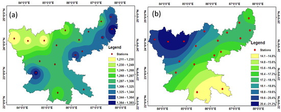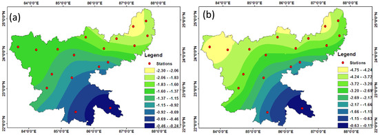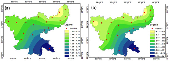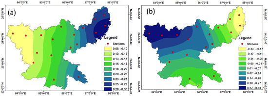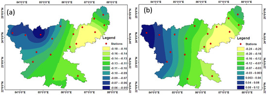 To analyze the spatial behavioral changes in rainfall, the linear regression slope of each station was interpolated using Kriging in ArcGIS environment for the whole study period (1901–2002) and after shift (1952–2002) which is shown in Figure 7, Figure 8, Figure 9, Figure 10 and Figure 11. The interpolated linear slopes for the annual precipitation for the period 1901 to 2002 (Figure 7a) indicated a negative slope all over the entire study area while for period 1952–2002 (Figure 7b), it varied from positive to negative. Positive linear slopes were found in Northern and South Eastern region that showed a decrease in rainfall from north to south east direction. For the whole study period, the negative slope value (which decreased up to −2.10 mm/year) was less in comparison to entire duration (up to −4.33 mm/year) in annual rainfall. While the rise in magnitude of trend is found only after the shift point (up to 0.84 mm/year). During monsoon season (Figure 8a,b) decrease in rainfall magnitude varied from −0.23 to −2.29 mm/year for the whole study period. The maximum negative slopes were shown by Deogarh, Godda, Dumka, Sahibganj, and Pakaur. The rainfall magnitude varied from −0.11 to −4.75 mm/year after shift point. Maximum negative slopes were shown by Chatra, Palamau, Deogarh, Kodarma, Godda, Dumka, and Sahibganj. Decline in rainfall increased during the period 1952-2002 as compared to the period 1901–2002.