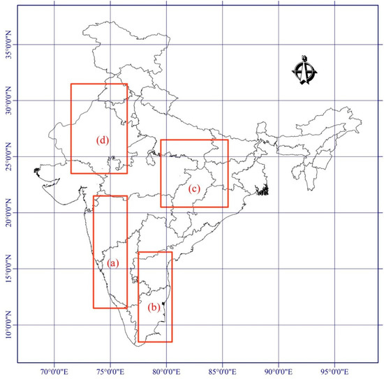 Study area and geographical subregions chosen for the study. The subregions are: subregion a, southwest (11.5° N–21.5° N, 73.5° E–76.5° E); subregion b, southeast (8.5° N–16.5° N, 77.5° E–80.5° E); subregion c, central (20.5° N–26.5° N, 79.5° E–85.5° E); and subregion d, northwest (23.5° N–31.5° N, 71.5° E–76.5° E).