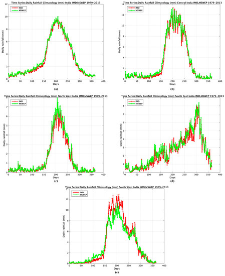Further, the statistical parameters of all India and its subregions’ daily climatological rainfall for the analysis period (1979–2013) have been tabulated in Table 3. The spatial average of the climatological mean rainfall over all India, southwest, southeast, central, and northwest, is 3.135 mm/day, 3.501 mm/day, 2.408 mm/day, 3.114 mm/day, and 1.372 mm/day, respectively, from IMD reference observations; that from MSWEP is 3.31 mm/day, 3.234 mm/day, 2.639 mm/day, 3.358 mm/day, and 1.530 mm/day, respectively. This shows that the spatial average of climatological mean from MSWEP is in accordance with the IMD rain gauge observations over the heavy/moderate rainfall regions of southwest/central regions and with low/less rainfall occurring northwest/southeast regions, though it slightly underestimates precipitation over the southwest region and slightly overestimates it over the remaining regions. The correlation coefficient (CC) for all India, southwest, southeast, central, and northwest regions is 0.8605, 0.8625, 0.8589, 0.8690, and 0.8628, respectively.