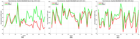 Time series of annual accumulated rainfall over India from IMD and MSWEP datasets from 1979 to 2013 for (a) MAM; (b) JJAS; and (c) ON.