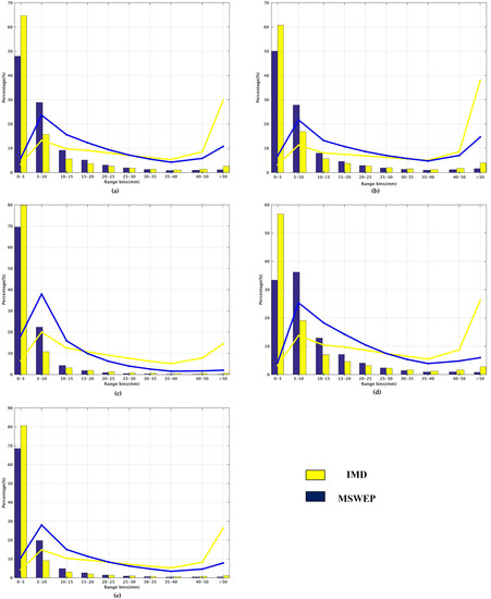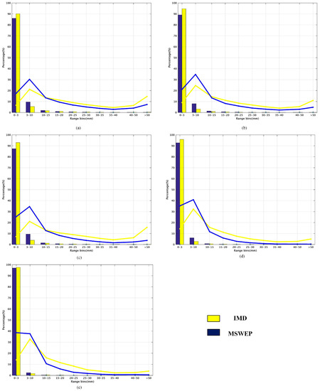Figure 5 shows the intensity distributions of daily rainfall and their contributions to total rainfall during the post-monsoon season (ON). During this season southern India receives high rainfall, which is evident from Figure 5, and the southeast and southwest regions show high contribution from heavy rainfall class (rainfall > 50 mm/day). MSWEP precipitation in the post-monsoon season follows a similar trend as in the monsoon season, where the low rainfall classes are overestimated, the middle rainfall class is estimated equivalent to IMD observations with slight variations, and the MSWEP product underestimates the heavy rainfall class (rainfall > 50 mm/day).