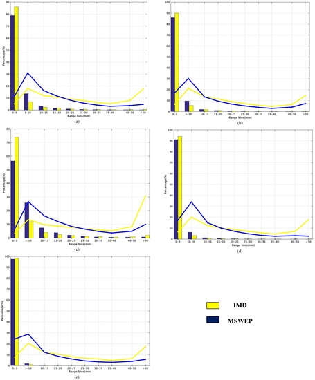The daily precipitation from MSWEP was assessed separately for the pre-monsoon, monsoon, and post-monsoon periods. In the study region, the MSWEP precipitation overestimated the rainfall amount contribution rates in the middle rainfall class ranges (3 mm/day < rainfall < 20 mm/day) but underestimated it in the heavy rainfall class (>50 mm/day). The precipitation classes that contribute the most to the total rainfall are key to understanding the overestimation/under-estimation. The detection of heavy rainfall classes is very important in the study of extreme hydro-meteorological events such as floods, but the overall MSWEP underestimates this class throughout the study region. However, it estimates middle rainfall classes in a fairly similar manner to the IMD gauge observations, as is evident from Figure 4, Figure 5 and Figure 6.