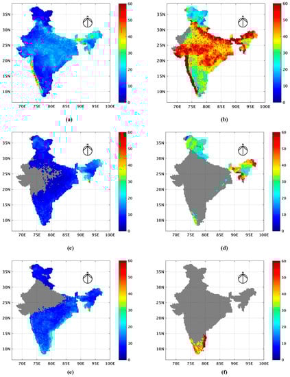 During the retreating monsoon season, a higher fraction of rainy days are mainly concentrated over southern India, mainly over the southeastern and western coastlines. Figure 10 and Figure 11 show the spatial distribution of indices values from daily rainfall for the post-monsoon season of India from 1979 to 2013 with a near-perfect POD and VHI values obtained from total rainfall (Figure 10a,b). Comparative analysis with the FAR and VFAR plots suggests that the MSWEP tends to falsely detect the precipitation over parts of central and northern India. For higher quantiles of rainfall (mainly > 75th quantile), MSWEP depicts an excellent detection rate over the northeastern region. It correctly captures the precipitation variability over space for the post-monsoon season. Comparative analysis with Figure 11 shows that for the post-monsoon season, the MSWEP depicts a MISS rate of ~0 for daily rainfall (for all of India), between 0.4 and 0.8 for rainfall > 75th quantile (covering most of south and southeastern India), and between 0.8 and 1 for rainfall > 95th quantile (covering a few parts of southern India).