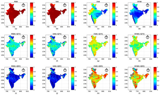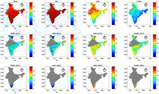(a–l) Spatial distribution of categorical indices for the MAM months over India for daily and higher quantiles of precipitation using MSWEP and IMD daily precipitation data from 1979 to 2013 showing POD (a,e,i); VHI (b,f,j); FAR (c,g,k); and VFAR (d,h,l).