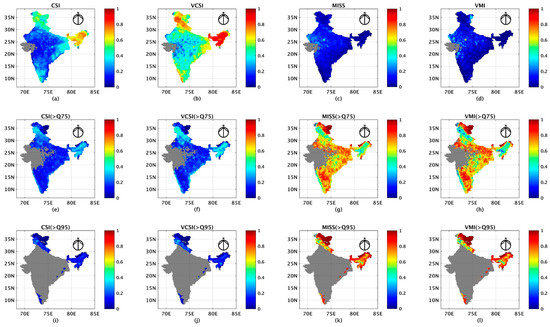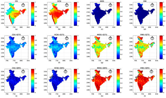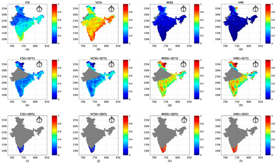 (a–l) Spatial distribution of categorical indices for the MAM months over India for daily and higher quantiles of precipitation using MSWEP and IMD daily precipitation data from 1979 to 2013 showing CSI (a,e,i); VCSI (b,f,j); MISS (c,g,k); and VMI (d,h,l).
