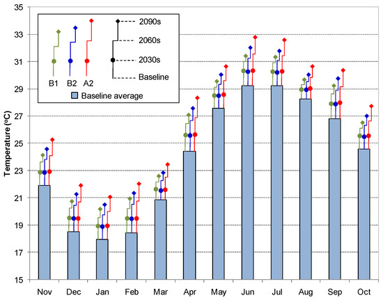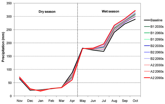 Figure 3 presents projected monthly average temperature for the basin average. Temperature is predicted to increase in all months, with warming rates ranging from 0.6 °C to 1.2 °C by the 2030s, from 1 °C to 2.5 °C by the 2060s, and from 1.4 °C to 3.9 °C by the 2090s, depending on the emission scenario and month. The highest warming rates are expected for February and April, with 3.6 °C and 3.9 °C by the 2090s according to scenario A2. Other months with a high warming rate are June and September, which are expected to warm by as much as 3.5 °C by the 2090s compared to the baseline average. In contrast, the smallest warming rates are predicted for March and August, with 2.6 °C and 2.3 °C, respectively, by the 2090s according to the high emission scenario (A2). From a seasonal point of view, temperature is likely to rise faster in the dry season (winter and spring) than in the wet season (summer and autumn). A faster warming rate in winter and spring may cause destruction of the seasonal cycle, gradually leading summer to come earlier than normal and winter and spring to become shorter. This issue has been discussed in several recent studies [28,29].