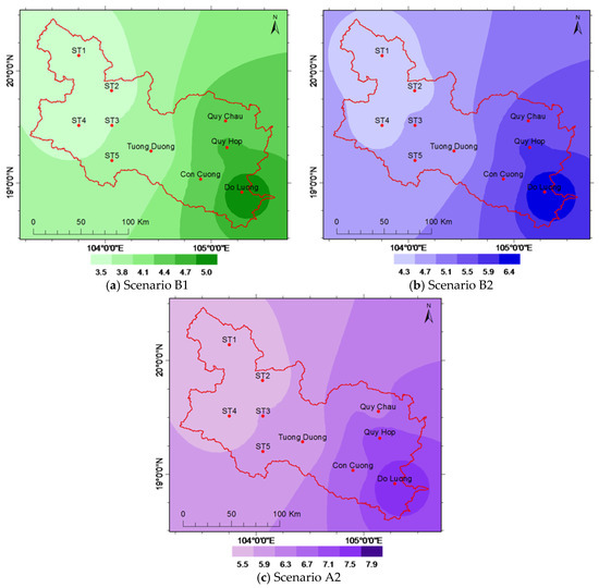 Considering the temperature prediction behaviors of the three selected scenarios B1, B2, and A2, it should be noted that the difference in behavior of the three scenarios changes with time. The three scenarios give similar predictions until the near future period (2030s), and then the predictions begin to diverge: temperature increases fastest under A2, followed by B2, and then B1. This is in line with the characteristics of the emission scenarios, which evolve similarly until the middle of the 21st century, when A2 becomes more negative due to the continuous increase in greenhouse gas emissions as a result of the increase in population growth. In contrast, B1 becomes less negative due to the slowing of population growth, and therefore a reduction in greenhouse gas emissions [1,30]. Similar findings have also been reported in several recent studies using IPCC TAR or IPCC AR4 models on a regional scale [31,32,33].