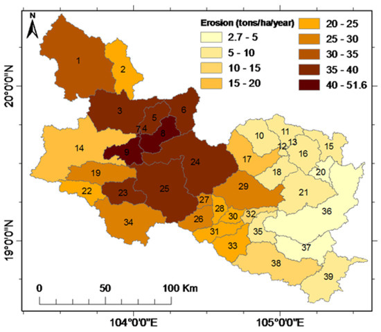 Figure 6 presents spatial patterns of erosion for the UCRW during the baseline period. The erosion rate ranges from 2.7 tons/ha/year to 51.6 tons/ha/year with a mean value of 21.3 tons/ha/year. In general, the upstream areas were found to have more severe erosion than the downstream areas. Among the 39 sub-watersheds in the UCRW, upstream sub-watersheds 4, 7, 8, and 9 were identified as having the highest erosion rates (more than 40 tons/ha/year), while downstream sub-watersheds 20, 36, and 37 were found to have the lowest erosion rates (less than 5 tons/ha/year). One possible reason for this is that upstream sub-watersheds have steep slopes and receive a large amount of rainfall (Figure 2a), and are subjected to shifting cultivation, while downstream sub-watersheds are mostly flat (Figure 2e). Interestingly, although the UCRW receives a large amount of rainfall in both upstream and downstream areas and less rainfall in its middle part, erosion was found to occur severely in the middle stream sub-watersheds (for example, sub-watersheds 24 and 25). This indicates that not only surface runoff plays an important role in the movement of soil particles, but the erosion process is substantially affected by other factors. We refer to Equation (3) to examine factors causing a high erosion rate for the identified areas. Equation (3) calculates erosion rate as a result of combined effects of rainfall (through surface runoff), soil erodibility factor (K), cover and management factor (C), support practice factor (P), topographic factor (LS), and coarse fragment factor (CFRG). Since soil in the watershed is mostly Ferralsols (deeply weathered red or yellow soil, dominated by low activity clays including mainly kaolinite and sesquioxides), soil-related factors (K and CFRG) could almost have the same values for the entire watershed. The P factor is related to soil conservation practice; it reflects the effects of practices that will reduce the amount and rate of the water runoff and thus reduce the amount of erosion. In this study, we assumed that no supporting practice was applied in the watershed. The C factor is related to land surface cover. C varies from zero to one, with high values for barren land and crop land (e.g., row crops, rice), and low values for forest land and pasture. Although most of the crop land (C was set at 0.3) is located downstream, the area of crop land is small. In addition, the upstream area—and especially middle stream area—are subjected to shifting cultivation and deforestation, resulting in large areas of barren land, which is highly sensitive to erosion. The topographic factor LS is a function of the land slope length and the angle of slope Thus, the larger the slope length, and the larger the slope angle are, the larger the topographic factor will be. In other words, the longer and steeper the slope of surface, the higher the risk for erosion. Therefore, although the middle stream area receives less rainfall than other parts (Figure 2a), due to the rugged terrain with long and steep hill slopes (Figure 2e) soil erosion was found to occur severely in this area. In short, the physical meaning of the two key factors (i.e., C and especially LS) discussed above can explain the spatial patterns of soil erosion in the UCRW.
