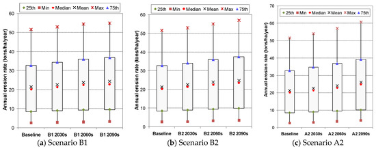 Box and whisker plots showing variation of annual erosion rates in sub-watersheds of the UCRW in the future time stages.
