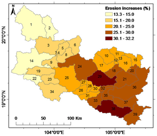 A map showing the spatial pattern of increase in erosion rate in the UCRW by the 2090s according to the high emission scenario A2 is shown in Figure 8. All sub-watersheds are projected to experience an increase in erosion rates ranging from approximately 13.3% to approximately 32.6%. It is noticeable that middle stream and downstream areas are projected to be more sensitive to climate change than upstream areas in terms of soil erosion. This may be due to the projected precipitation and temperature, both of which are projected to increase more in the middle stream and downstream areas than in the upstream areas. In general, a larger increase in precipitation will produce a greater increase in surface runoff, which is a direct factor causing more erosion (Equation 3). Increases in temperature may to a certain extent facilitate plant growth, but temperature in the UCRW is already high, and an increase in temperature in the area may cause stress to plants, consequently leading to a reduction in plant biomass [1]. On the other hand, an increase in temperature and a resulting increase in moisture will likely cause a faster residue decomposition process due to an increase in microbial activity [1,4,34]. These would lead to a reduction in biological ground cover, making the area more exposed to the projected increasing precipitation, and ultimately lead to more erosion. Large increases in erosion rate in some middle stream sub-watersheds can also be explained by the steep topography of these sub-watersheds. The effect of increased rainfall due to climate change on erosion in steep areas has been reported previously [19].