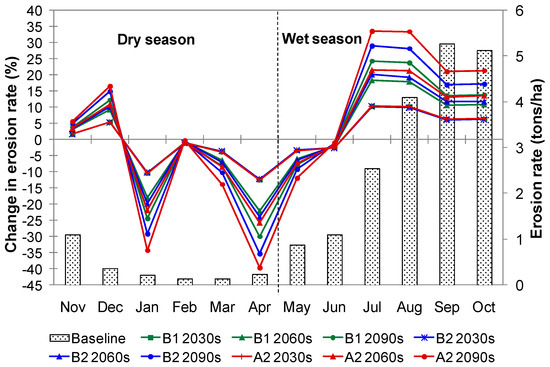 The temporal pattern of climate change impacts on erosion rate in the UCRW was investigated. The column chart in Figure 9 presents average monthly erosion rate for the baseline period, while the line chart presents projected change in erosion rate in the future time stages relative to the baseline period. Average intra-annual (monthly) erosion rate of the baseline period varies from 0.15 tons/ha (February) to 5.3 tons/ha (September), with an annual total of 21.3 tons/ha. In general, erosion rates in the wet season months are much higher than in the dry season months. The seasonal erosion rate for the dry season is 2.2 tons/ha, and for the wet season is 19.1 tons/ha. Predicted monthly change in the erosion rate ranges from a 39.5% decrease to a 33.4% increase depending on the specific month, emission scenario, and time period. From a seasonal point of view, the erosion rate is predicted to increase from mid wet season to early dry season (July to December), and to decrease from mid dry season to early wet season (January to June). Increases in the erosion rate in the months from July to December can be explained by the projected increases in precipitation in these months. When precipitation increases, its erosive power and sediment transport capacity increase, resulting in an increase of erosion. However, it should be noted that the magnitudes and patterns of the change in erosion rate are not consistent with that of the change in precipitation. This is because besides precipitation (and as a result, surface runoff), erosion rate depends on other factors such as evaporation, topography, soil, land cover, and plant growth, etc. For example, a decrease in the erosion rate during the months from January to June may be related to changes in antecedent soil water content during precipitation events under future climate conditions. Even when an increase in precipitation was predicted, an increase in evaporation (due to the warmer climate) appeared to cause a reduction in soil water content which may lead to an increase in saturation deficit. This means that more precipitation is needed to bring the soil to saturation and generate the same amount of runoff as under the current climate conditions. The role of antecedent soil water content on soil erosion in saturation excess dominated areas has been reported [19,34]. In addition, increased temperature and increased precipitation in the dry-cold months (spring) may also accelerate plant growth, which results in increased biological cover, and less erosion as a result. However, it should be noted that the decrease in erosion rate in February and June is very small, and the pattern of the decrease is complicated. While in the other months, the magnitude of changes (increase or decrease) becomes larger with time, the magnitude of decrease in these two months decreases gradually toward zero. This means that if a larger increase in precipitation was predicted, the change in erosion rate in these two months would be positive (turn to an increase, following the increasing trend of rainfall).
