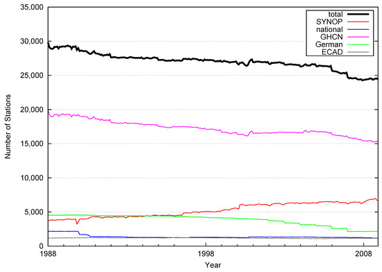 The GPCC at Deutscher Wetterdienst (DWD) provides daily precipitation products created from station-based rain gauge measurement data. Data are mainly received from national meteorological and hydrological services. Other sources are used as well, e.g., from local authorities, global and regional data collections, and near real-time World Meteorological Organisation Global Telecommunicataion System (WMO-GTS) CLIMAT and SYNOP data. At first, the retrieved station data are checked for quality, e.g., common problems are coding errors in SYNOP data, different latin transcriptions of station names, or transmission errors. Figure 1 shows the number of available stations for the dataset split up into the different sources. The total number of used stations lies approximately between 30,000 in 1988 and 25,000 in 2008.